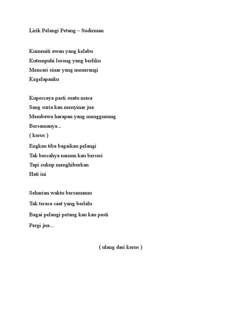 Sudirman - Pelangi Petang Chord - Malaykord Tab Chords Easy Chord Lyrics. Lirik Pelangi Petang - Sudirman. Membawa harapan yang menggunung.